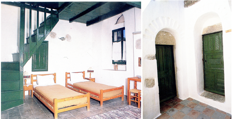 Architectural interventions in the interiors were based on the conservation of the building’s envelope authentic elements as well as the functional configuration with the least possible modifications: mainly the transformation of small storage rooms into bathrooms. The destroyed parts were restored to their previous forms using documentation in the form of oral testimonies, photographic or other archival material. The image of these guesthouses is completed by a series of wooden furniture items designed with the simplicity of traditional Greek pieces as iron or wooden beds, stools and chairs. These wooden elements stand humbly, besides traditional structural elements such as the whitewashed or stone walls and domes, semicircular window arches, alcoves, armoires, semi-enclosed transitive open spaces, etc. The evident interventions concern confined electricity and lighting installations. The sense of “authentic reproduction” and its “authentication”[38] by the GNTO services is supported by the evaluation of various information sources that included the use and function, tradition and techniques, spirit and sensation and other internal and external aspects[39].