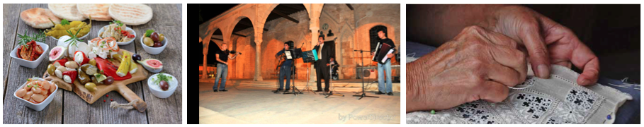 The UNESCO list of Intangible Cultural Heritage and the Register of good safeguarding practices refers to Cyprus with 3 different elements: the Mediterranean diet, the tsiattista poetic duelling and the Lefkaritiko lace making (fig.1a,b,c).