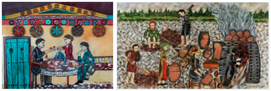 Figure 2: Everyday life and Cypriot culture as expressed by the folk painter Kasialos: a. Διασκέδαση (entertainment), b. Κόβουν πλινθάρκα, (Adobe making)
