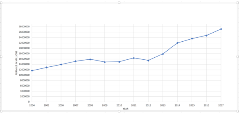From 2004 to 2017, the total number of arrivals of foreigners (or non-residents) in Greece shows an upward trend with some significant fluctuations over the five-year period of 2008-2013.
