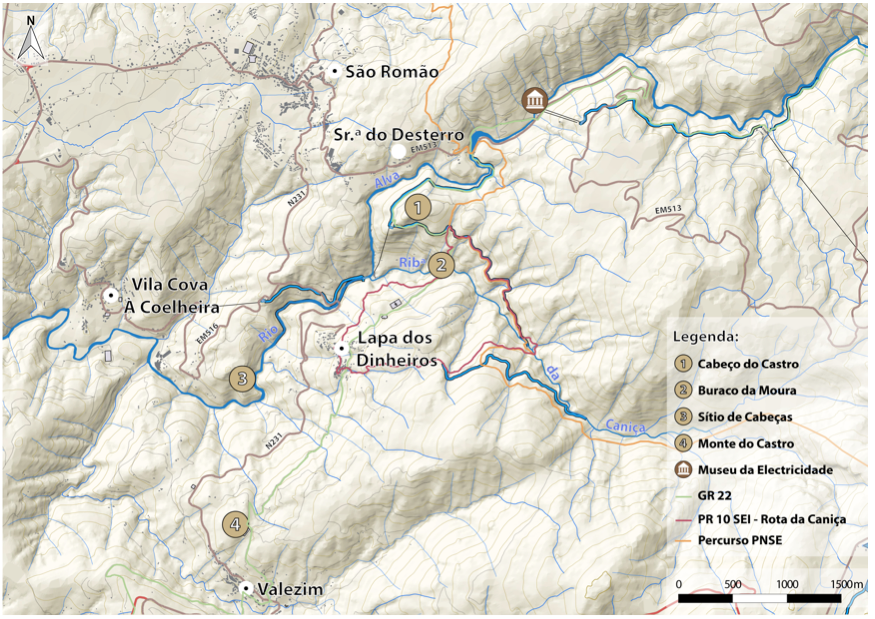 The main places are Cabeço do Castro de São Romão, Cabeças and Monte do Castro, situated in the municipality of Seia in typical "mountain sites", considering the great visibility conditions in short, medium and long distances, making possible to control people and good flows next to Portelas and old ways.