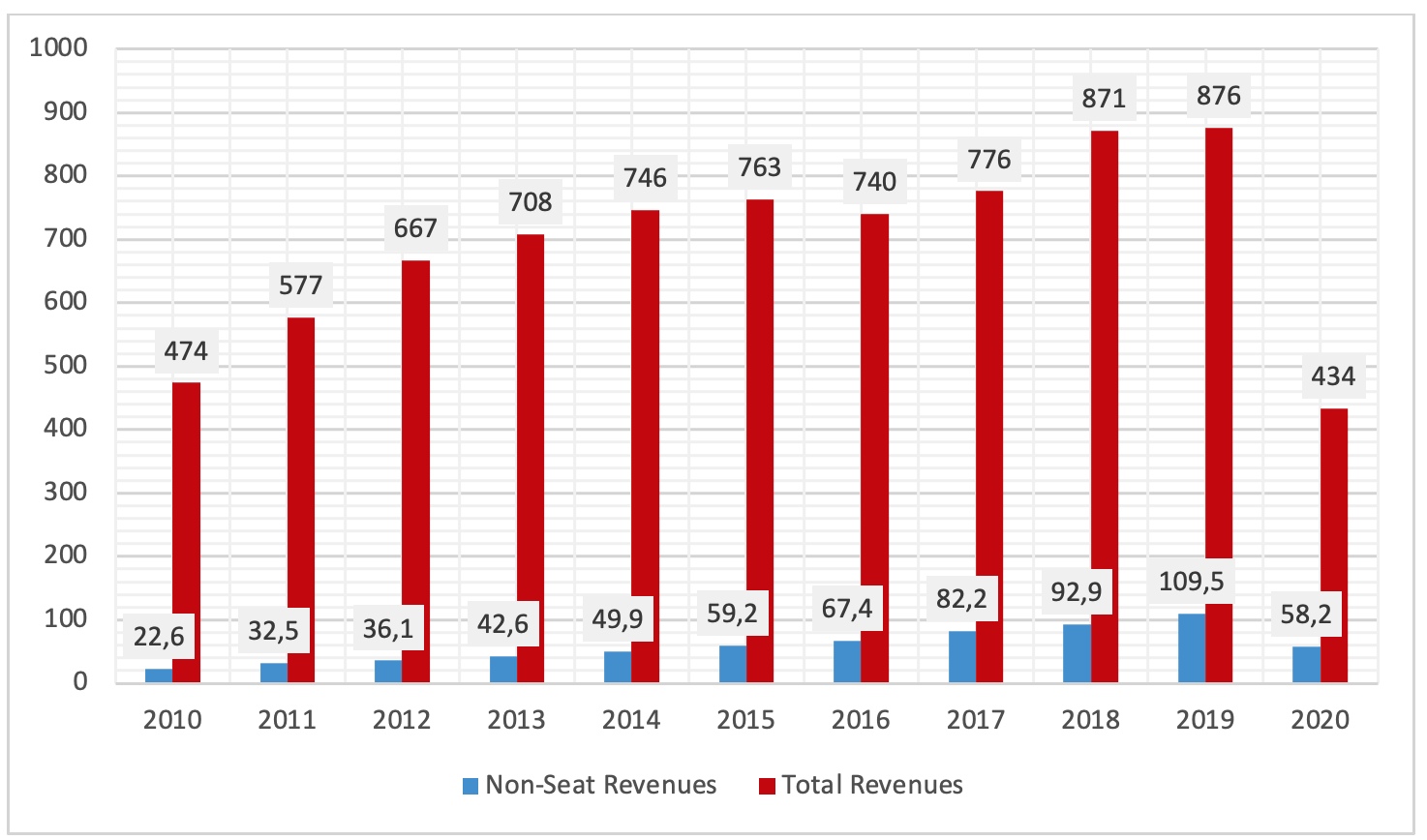 Graph 1: Comparison of Airlines’ Non-Seat & Total Revenues (in $Billion) SOURCE: IdeaWorks 2018; Statista, 2021; IATA, 2021