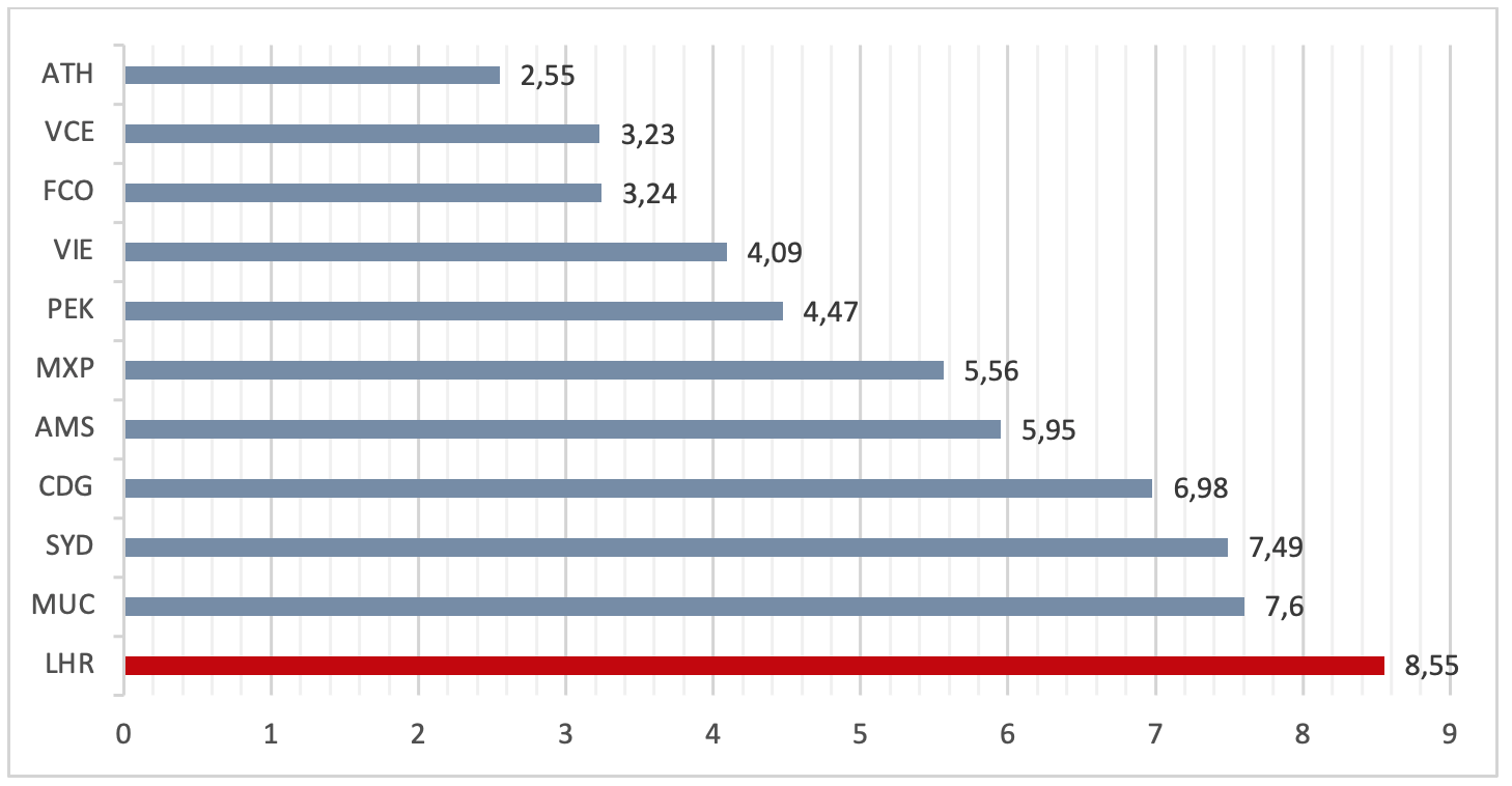 Although, not only airlines seem to implement ancillary revenues strategies to boost their revenues. According to CAPA (2019), 39.9% of airports revenues were generated from non-aeronautical sources, which include non-aeronautical revenues as expressed by per passenger expenditure, duty-free concessions revenues, commercial activities and infrastructure as well as non-aeronautical infrastructure. Airports Council International (ACI, 2016) stated that airports around the world achieved more than 64,3 billion dollars from ancillary revenues policies, presenting a surge of 3.6% regarding the previous year. London Heathrow Airport is an example of the importance of ancillary revenues for the airports. The graphs below (Graph 2 & Graph 3) present the comparison between Heathrow Airport and other UK airports, as well as the competitive scenery of the international market, regarding airports’ commercial revenues.