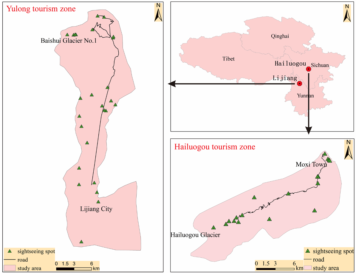 In China, glacial tourism emerged in the 1990s. Since then, the number of glacial tourist attractions has increased to more than 20, spread across Yunnan, Sichuan, Tibet, Qinghai, Gansu and Xinjiang Provinces in western China. Among these scenic locations, the Yulong Snow Mountain Glacier Park and the Hailuogou Glacier Forest Park are typical examples, with low elevations, easy access, complex and diverse glacial landforms, and beautiful natural scenery (Wang et al., 2010). The glaciers offer numerous tourism activities and attract many tourists.
