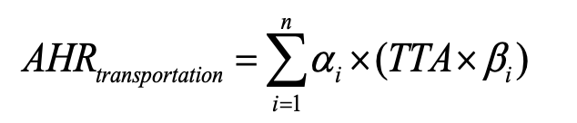 where AHRtransportation refers to the heat release from transportation, ai is the AHR coefficient for the ith type of vehicle (including two types of vehicles, small and large), TTA represents the total tourist arrivals, and bi is the proportion of tourists who use the ith type of vehicle.