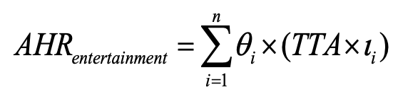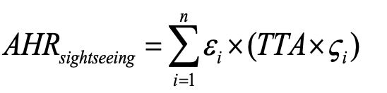 In equation (6), AHRentertainment is the heat release from tourism entertainment, θi is the AHR coefficient of the ith type of entertainment activity (including hotel entertainment, karaoke, bars, shows, and campfire parties), and ιi is the proportion of tourist arrivals who participate in the ith type of entertainment activity.
