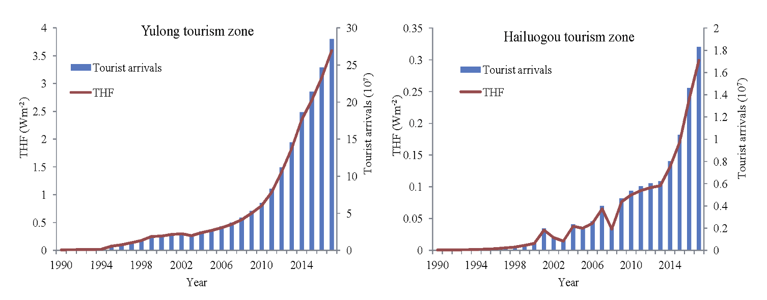 Currently, China is in an era of comprehensive mass tourism development. The rapid development exhibited by the Yulong and Hailuogou tourism zones since 1990 is representative of this overall trend. In the near term, both zones are forecasted to continue developing rapidly. If tourist arrivals are calculated based on the average annual growth rates of 25.1% and 27.2% that occurred during the period 1990-2017, tourist arrivals in the two zones will reach 5.6×107 and 3.7×106, respectively, by 2020. The THFs will increase to 7.0 Wm-2 and 0.6 Wm-2 in the Yulong and Hailuogou tourism zones, respectively, resulting in increases of 95.3% and 106.0% over 2017. If tourist arrivals are conservatively estimated using the national average of 10% (The People’s Republic of China, 2015), by 2020, tourist arrivals in the Yulong and Hailuogou tourism zones will reach 3.8×107 and 2.4×106, respectively. The THFs of the tourism zones will increase to 4.8 Wm-2 and 0.4 Wm-2, respectively, an overall increase of 33.3% over 2017. These projections indicate that the effect of the THF from large-scale tourism activities will continuously increase, accelerating glacial melting.