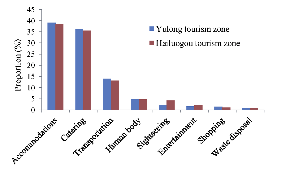 Energy consumption data and the proportions of tourists and tourism firms were primarily obtained through field surveys conducted by the authors during 2016-2017. Survey questionnaires related to transportation, accommodation, sightseeing, catering, entertainment, shopping, and waste disposal were distributed to tourists (n=1,200) and tourism firms (n=400) in the Yulong and Hailuogou tourism zones. Of these, 1,113 and 329 valid questionnaires were recovered for the two sites, corresponding to recovery rates of 92.8% and 82.3%, respectively. Specifically, 680 and 220 survey questionnaires were distributed to tourists and tourism firms, respectively, in the Yulong tourism zone, and 631 and 182 valid questionnaires were recovered, resulting in respective recovery rates of 92.8% and 82.7%, respectively. In the Hailuogou tourism zone, 520 and 180 survey questionnaires were distributed to tourists and tourism firms, respectively, and 482 and 147 valid questionnaires were recovered, yielding recovery rates of 92.7% and 81.7%, respectively. In addition, based on the results of field surveys, we calculated the proportions and other coefficients in the Yulong and Hailuogou tourism zones (see Table 2).