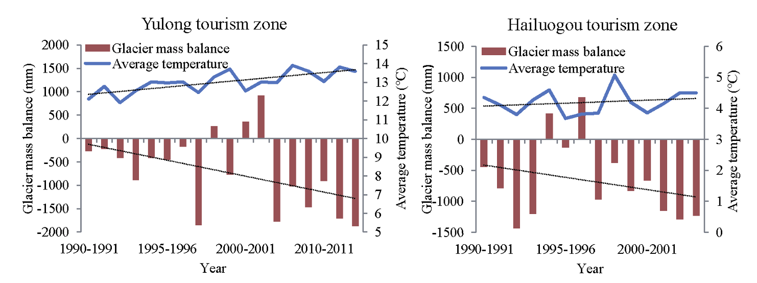 Fig. 5. Average temperatures and changes in the glacial mass balance in the Yulong and Hailuogou tourism zones