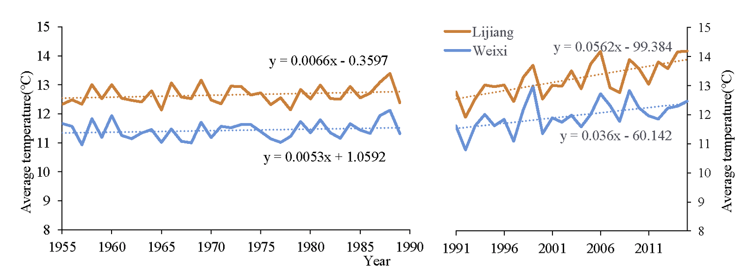 Tourist arrival data were obtained from the Lijiang Tourism Development Committee and the Hailuogou Scenic Spot Administration. Meteorological data and glacial change data (glacier mass balance, an important indicator reflecting glacial changes) were obtained from the Yulong Snow Mountain Glacier and Environmental Observation Station, the Gongga Mountain Alpine Ecosystem Observation and Experiment Station of the Chinese Academy of Sciences, and the Weixi Meteorological Station, where routine observations regarding meteorological changes and glacial changes in the Yulong and Hailuogou tourism zones were made. Based on the meteorological data, we calculated the average temperature of the Yulong and Hailuogou tourism zones and that of Weixi County.