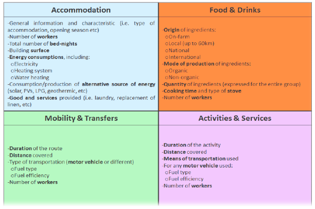 Figure 1 shows the four categories of main activities envisioned in an ecotourism package and the main parameters and data needed to assess the Ecological Footprint for each of the four categories.