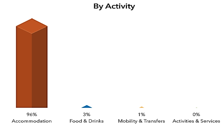 The most ecotourism activity that has a great impact on the ecological footprint of siwa is accommodation with nearly 96% of the total ecological footprint of the whole ecotourism packages as shown in figure (3). This category is about all the hosting facilities included in the package to accommodate tourists including general information and characteristics of the accommodation facility, number of workers, total number of bed-nights, energy consumptions including electricity, heating system, water heating, A/C, any alternative sources of energy and finally goods and services provided such as laundry, replacement of linen and etc. This high percentage is so much contradicted with the shape and nature of accommodation facilities in siwa, which mostly take the form of environmentally friendly ecologies. Thus, this gives an indication that not all the practices in these ecolodges are 100% eco-friendly as most of the ecolodges in the sample are not certified internationally or nationally with green labels to ensure the level of conveniency and suitability of their practices to the environment. Most of ecolodges in the sample don't depend on renewable sources of energy. They don't apply effective techniques and technologies to reduce energy consumption. Most of them don’t have the infrastructure needed to apply water recycling and conservation strategies.