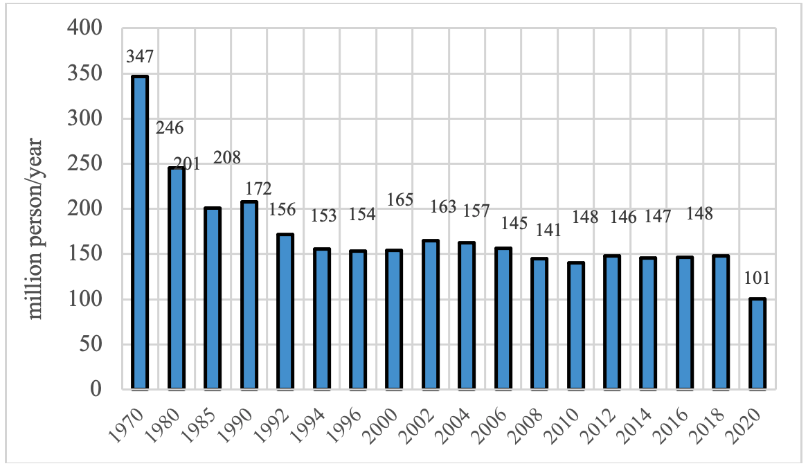 Figure 1: Statistics on rail passenger transport (1970–2020; million persons/year)
