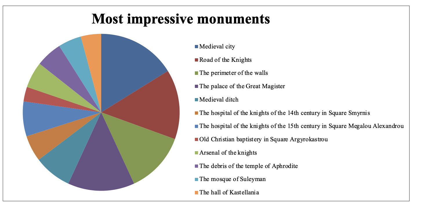 The above-mentioned monuments stand out, with the Medieval Town (94.4%), the Knights' Street and the perimeter of the walls (80.6%) and the Palace of the Grand Master (69.9%) being the first preference of visitors. The majority of respondents consider most of these monuments to be in a very well-preserved condition, with the best preserved being the famous Knights' Street (72.8%) and the Castle Church of Our Lady of the Castle (29.4%) being less well preserved.