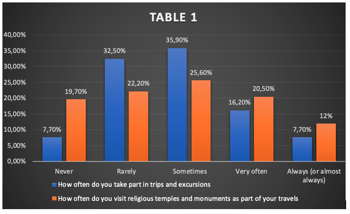 The first Table showcases the answers to questions b1 and b2, in particular «How often do you take part in trips and excursions» and «How often do you visit religious temples and monuments as part of your travels».