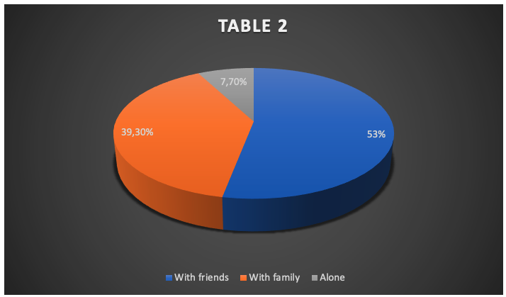 As shown in the second table, the majority of the respondents travel with friends (53%) or with their family (39,3%) while only 7,7% travel alone.