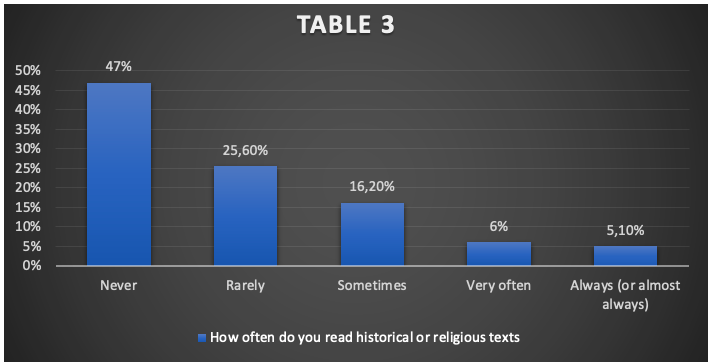 The respondents answered that they do not usually read religious or historical texts, with an average score of 1.95, while 47% stated that they never read them. It seems that they prefer to use other mediums for their information such as the internet, which does not always offer the best quality of information.