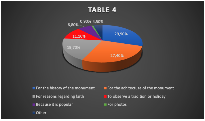 As shown in Table 4, respondents were given the option to choose their main motivation for visiting monuments. The main options are six but the possibility to fill the “other” case with additional motivations which are not in the list is provided. As we can see, most students visit religious monuments for cultural reasons, with a total of 57,3% visiting them for their history or architecture, while at the same time a significant percentage of 30,8% of respondents visit them for religious reasons such as participating in religious festivals or for practicing their faith. At this point, a percentage (6,8%) should be taken into account which organizes trips and visits to monuments for reasons of popularity.