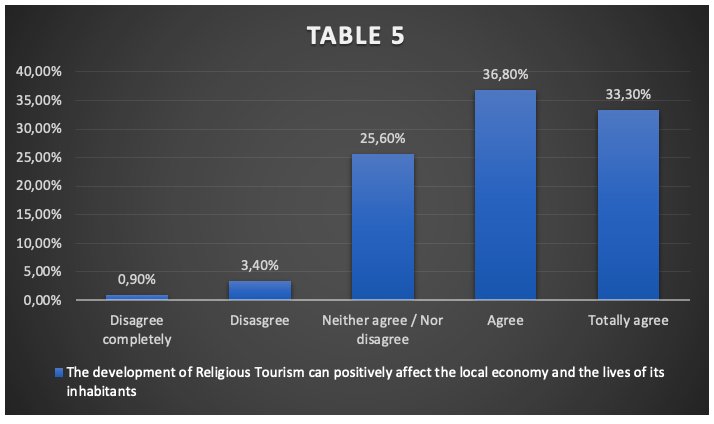 The answers of the respondents conclude in a positive assessment of the results obtained from Religious Tourism regarding the growth of the economy and the living conditions of the recipient area. They agree that this type of development can bring positive results, with a mean number of 3.98