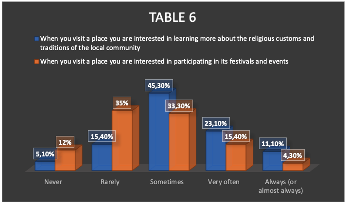 As seen in table 6 the majority of respondents, with a percentage of 79,5%, are interested in being informed and learning more about the religious traditions of the place they are visiting. However, the percentage that participates in celebrations and events appears reduced. It makes sense, to an extent, due to the fact that events and festivals usually only take place on certain days within the calendar year. It is difficult for most travelers and of course for the students, who our research sample consists of, to have the free time and the possibility to partake in religious activities that are limited to certain days.