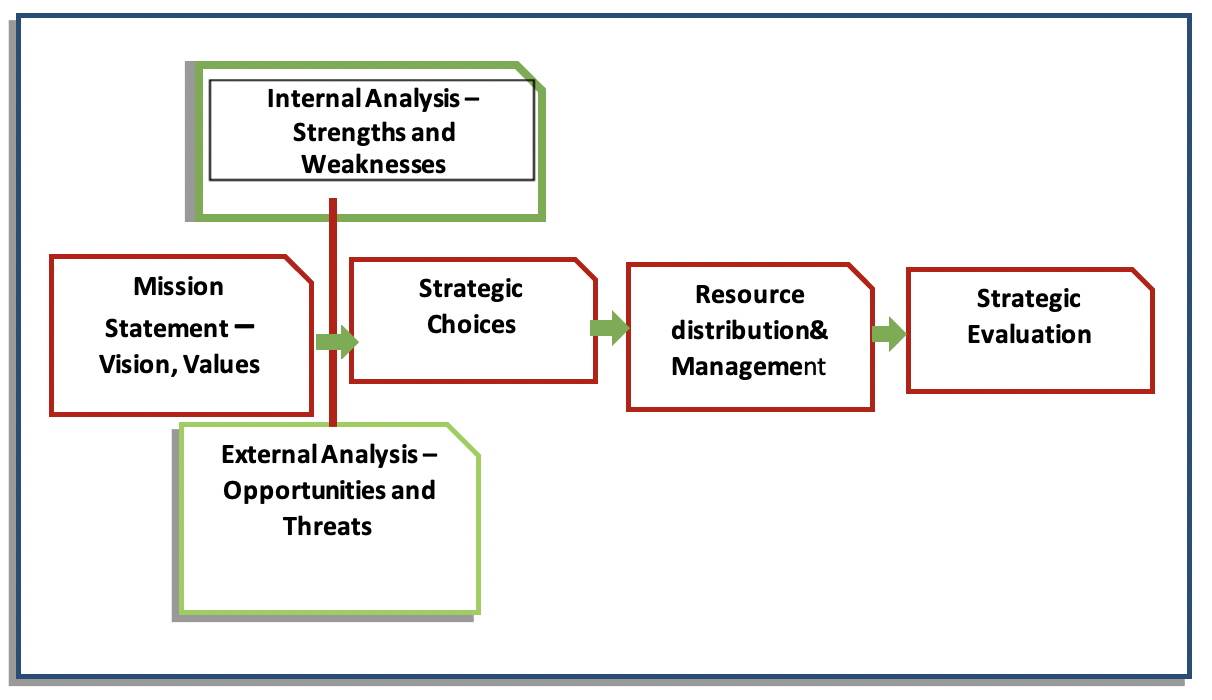 The first stage for shaping the strategic direction involves analyzing the potential strengths, weaknesses, opportunities, and threats of the overall environment of the business (SWOT analysis, PESTEL Analysis), followed by the design and organizational plans of the strategy, which are evaluated in the end. (Enz, 2011).