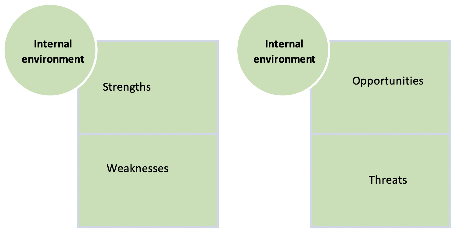 To determine and define the appropriate strategy for a business, an analysis of its internal and external operating environment (SWOT Analysis) is required. The information gained through clarification and analysis of the strengths, weaknesses, opportunities, and threats of the environment can contribute to the success of the mission and defined goals of the business (Figure 4).