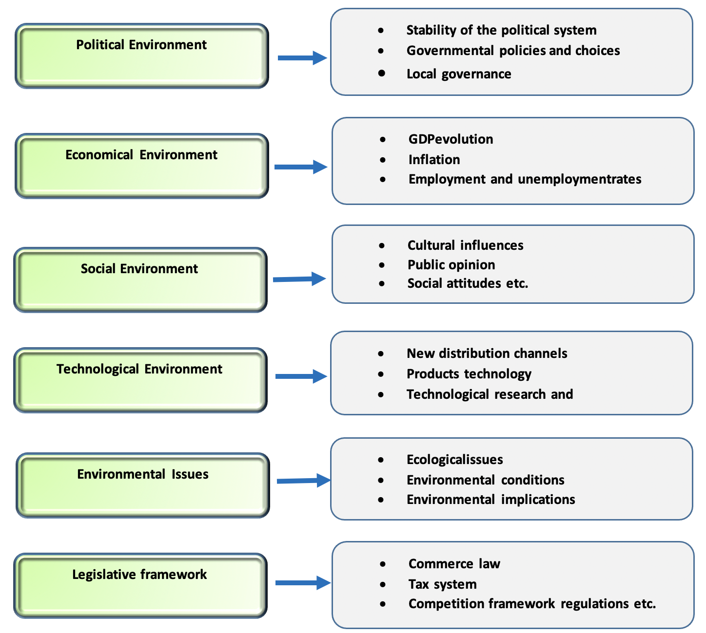 The internal environment of the business concerns the analysis of its resources and systems, such as technological knowledge and human capabilities, organization, profile, and characteristics of the business, as well as its financial ability. The analysis of the external environment involves identifying variables such as competition, legal environment, market and investments, technological progress, consumer trends and preferences, economic conditions, and adapting the business to them (Kourtis, 2004, Papadakis, 2016, Thompson & Stickland, 2005).