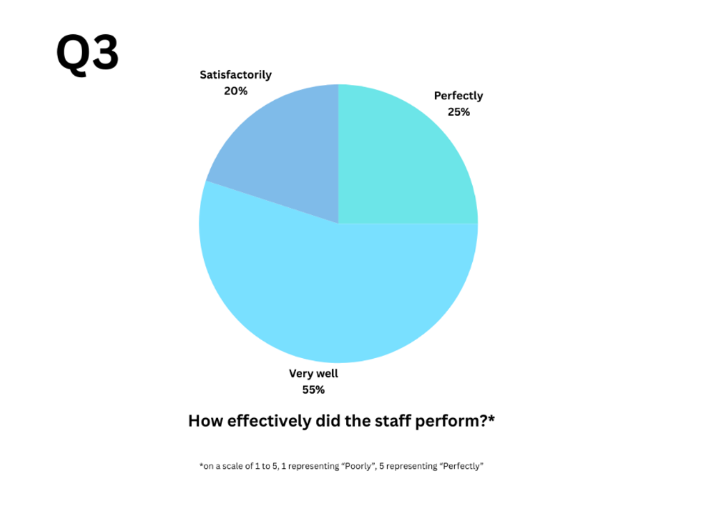 The third question required that the managers rated on a scale of 1 through 5 the effectiveness of their staff’s actions during the crisis. The number 1, as seen on the graph above, represents poor effectiveness while the number 5 represents complete effectiveness. The vast majority of the respondents stated that the staff performance was either perfect or very good, and one in five stated that it was just satisfactory.
