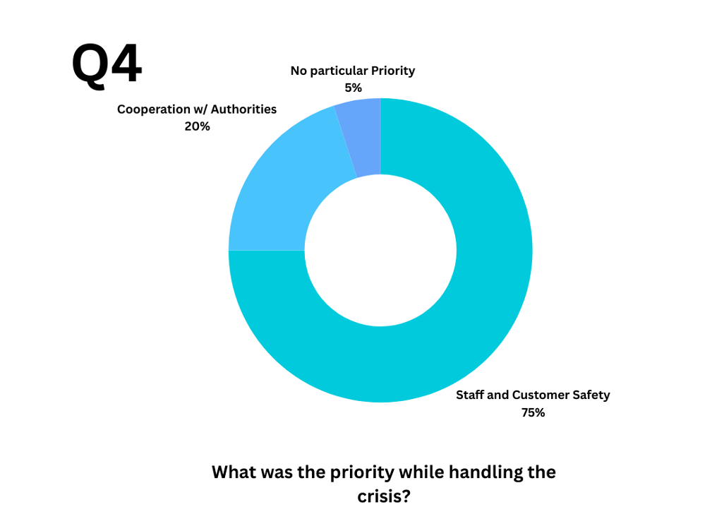 As seen above, the fourth question is about the management’s priorities while the crisis was ongoing. Three out of four respondents stated that staff and customer safety where their main priority while the situation was taking place, and while another 20% said that they focused on cooperating and dealing with the problem with local authorities, 5% of the managers had not had a particular priority in mind while assessing the situation.
