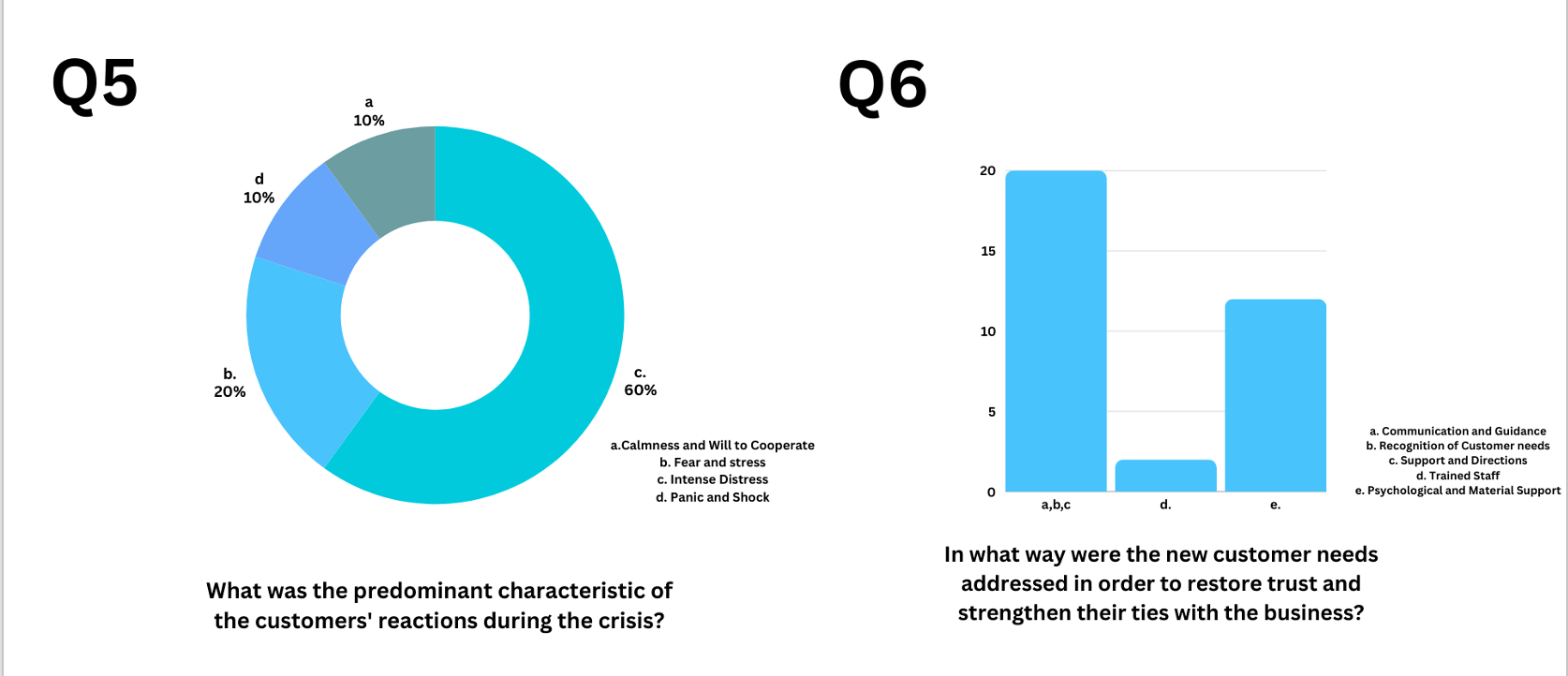 The following questions pertained to the customers’ psychological state as well as the way their needs that arose following the crisis’ start were addressed by the hotel. As expected, most of the customers were in a state of intense distress, while a smaller percentage expressed a series of more extreme emotions such as panic and shock. One in four customers expressed a certain level of calmness and composure as well as lower amounts of stress. Lastly, on the management’s side, a lot of attention is paid to restoring the ties and the trust between the establishment and the customers, as seen on the Q6 graph.