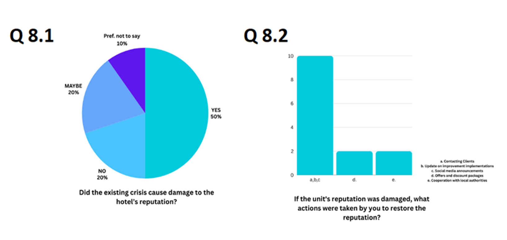 The fourth and final hypothesis is that crises taking place outside of hotel grounds have significant effects on the hotel’s reputation. As seen on the graphs Q8 & Q8.1, most managers responded positively, while some either did not respond or were not certain. Only 20% of the respondents responded negatively and recognized no harm to the hotel’s reputation. Of those that responded positively, 100% stated that they acted towards restoring the establishment’s reputation, mostly by contacting their clientele, updating their safety-improvement implementations and finally by offering offers and discounts to regain their old customers and approach new ones. As described above, the fourth hypothesis also proves to be correct by the analysis.