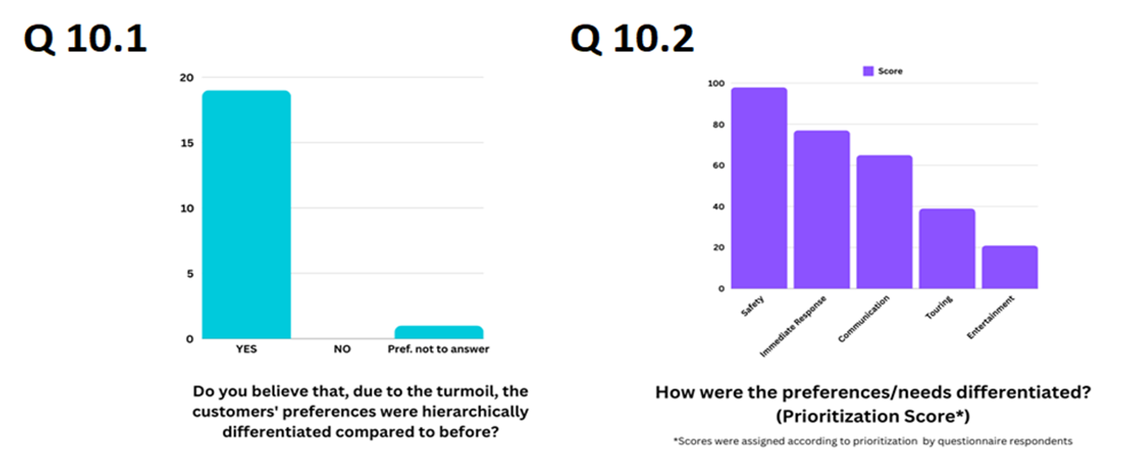 The first hypothesis of the article is that adverse conditions have a significant impact on customer needs and psychology, while the second hypothesis talks about the remaining effects of the crisis on guest needs after situation concludes. Firstly, in the Q5 graph we can see the initial reactions of customers, of which only a slight percentage manages to maintain their composure and calmness, while 90% of the managers stated that their guests had a certain level of distress. The highest percentage of reports mentions a high level of distress. Moving forward to the results yielded by the ninth question, as seen on graph Q9, only 5% of the respondents referred to the effect in their customers’ psychology as slight, while 95% mention a significant level of psychological distress. Finally, according to the graphs Q10. & Q10.1, it’s stated that, even after the end of the crisis, the prioritization of the guests’ needs remained affected. Hierarchically, in contrast to expected prioritized needs in an out-of-crisis state, safety, immediate responses and communication were the top three needs, while entertainment and touring came last. The two initial hypotheses, according to the analysis, prove to be correct.