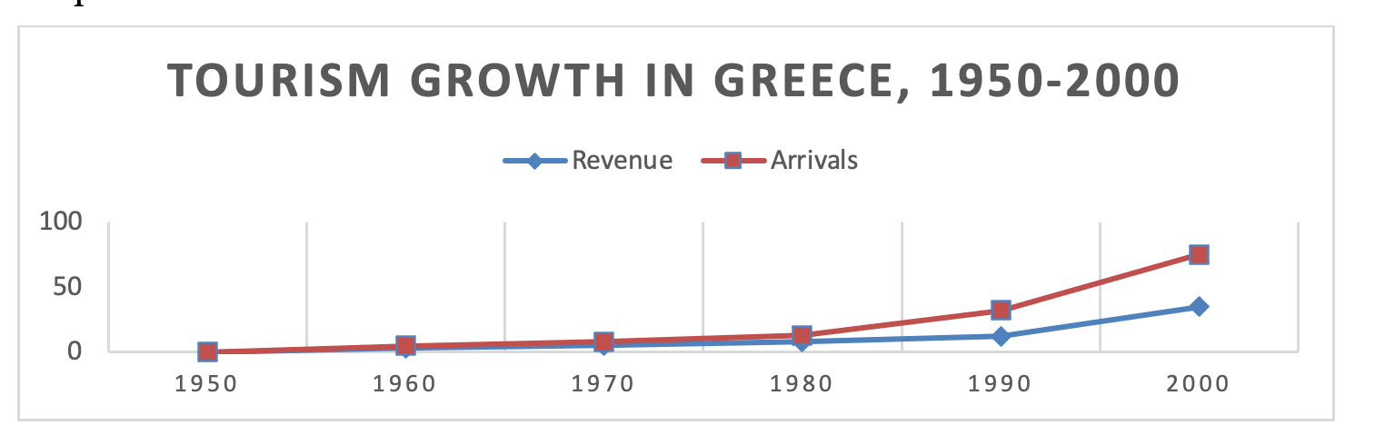 According to SETE (2003), between 1950 and 1990, the growth of Greek tourism exceeded both European and global growth rates, as illustrated in graph (3.1). In particular, between 1990 and 2000, film tourism experienced a significant surge, contributing to Greece’s ranking among the countries with the highest tourism growth (Buhalis, 2001). Consequently, the tourism industry in island destinations is experiencing a period of growth.