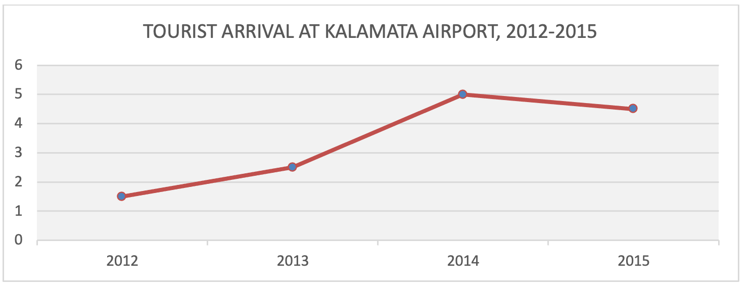 In 2002, Greece was the 13th most popular travel destination, worldwide, and the 8th most popular European destination (WHO, 2003). The film Before Midnight, served as a catalyst for tourism in Greece, with various regions of Messinia selected for filming. Following the release of the film, a surge in tourist arrivals at Kalamata Airport was observed between 2013 and 2014, as illustrated in the following graph (3.2).