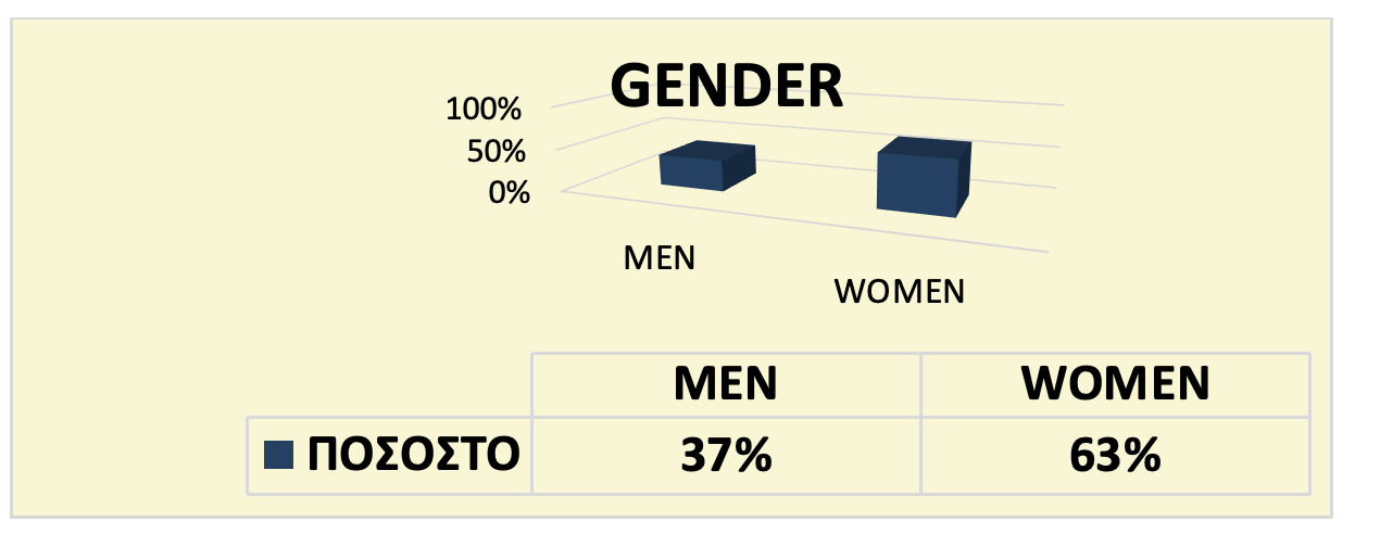 As illustrated in the accompanying graphs, the majority of survey participants were women, comprising 63 of the total. Conversely, men constituted only 37% of all participants.