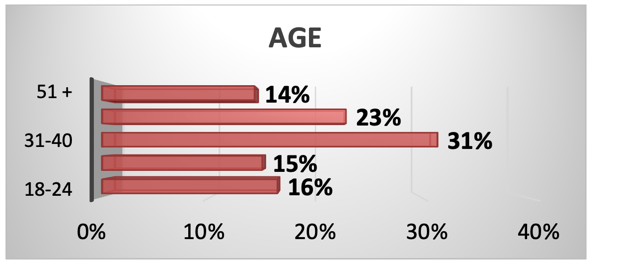 The above graph illustrates that the largest percentage of responders to our survey fell within the age groups of 31-40 and 41-50 years old with respective percentages of 31% and 23%. The next large age group is that of 18-24 years old with a percentage of 16%. This is followed by the 25-30 years old with a percentage of 15%. Finally, the age group of 51 years old and above received 14% of the respondents.