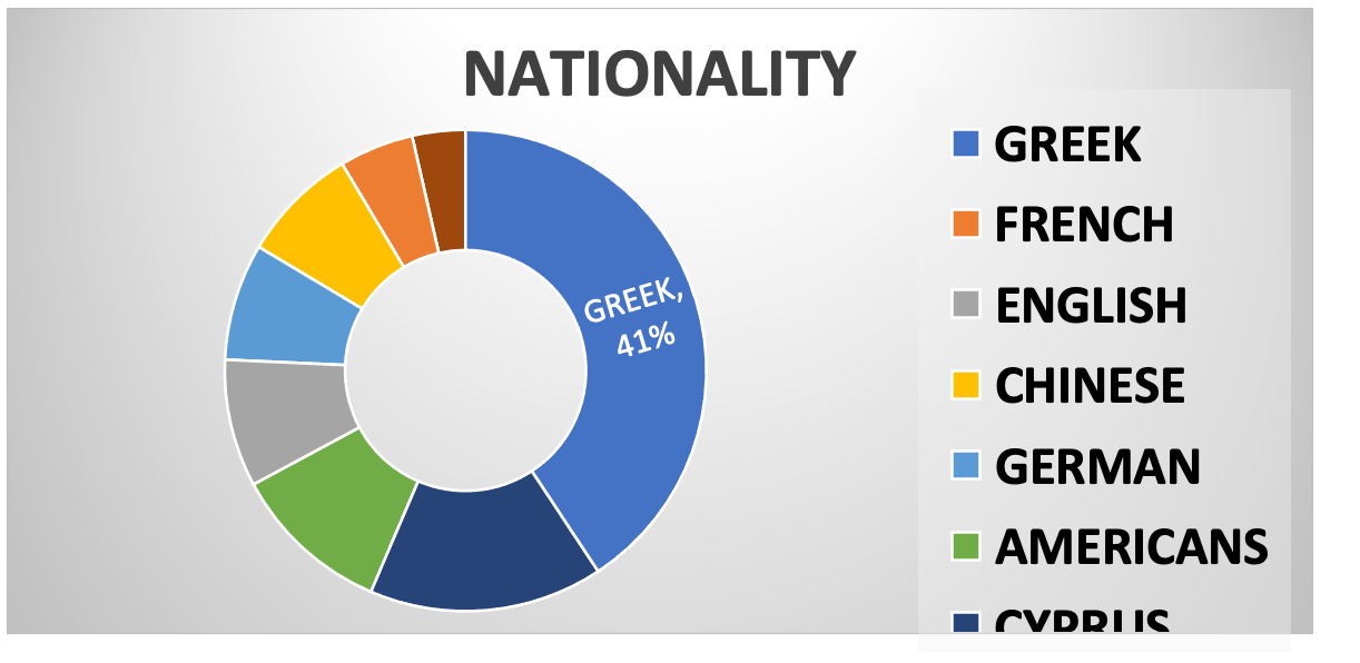 Question 3 sought to obtain a sample of respondents from different nationalities in order to obtain as many thorough and objective answers as possible at the international level. To this purpose, questionnaires written in English were also distributed. The results of the analysis indicated that the majority of the respondents were Greek (41%), while Cypriots also held a high percentage (16%). The next most prevalent nationality was that of is Americans with 11% of respondents identifying as such. English nationals constituted 9% of the sample, while Germans and Chinese respondents made up 8% of the total. French nationals accounted for 5% of the sample, and Italians constituted 4% of the total.