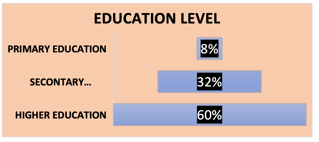 The above figure indicates that the educational level of the participants was relatively high, with 60% having completed higher education and obtained a degree. It can be observed that 32% of the participants had completed secondary education, while only 8% had completed basic education (primary education).