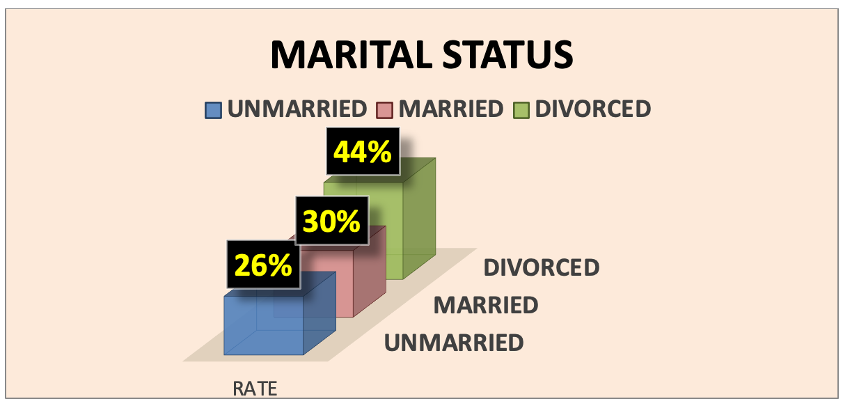 The survey results indicated that 44% of the participants were divorced, 30% were married, and 26% were unmarried.