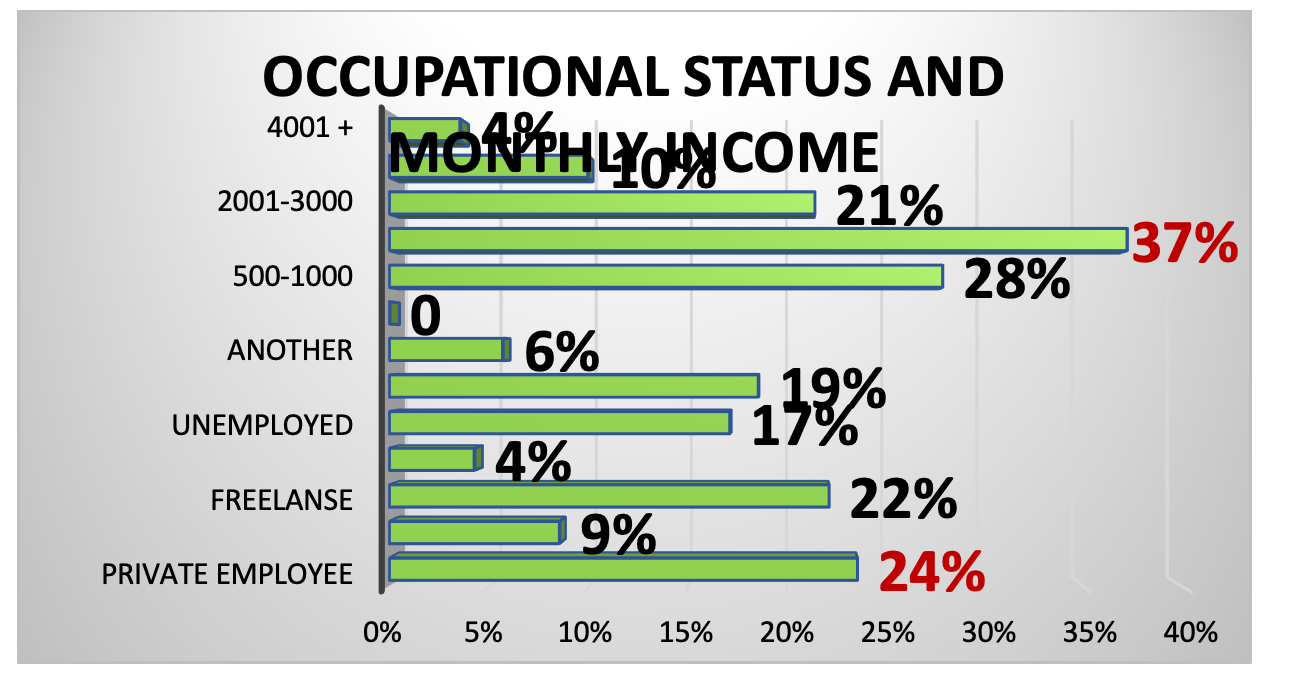 The results of the survey, as illustrated in the summary graph above, indicate that the majority of participants (24%) are employed in the private sector as private employees. The monthly income of respondents was found to be in the range of 1,001 to 2,000 euros, with a percentage of 37%