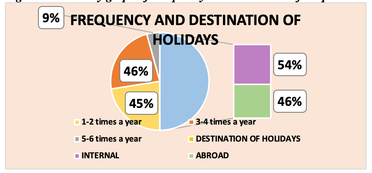 The above figure illustrates that the majority of participants, specifically 54% of the respondents, express a preference for traveling more frequently to various destinations within the country. Moreover, the majority of participants (46%) indicated that they take multiple holidays per year, with 3 to 4 trips per year being the most common frequency.