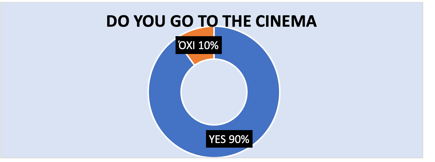As illustrated in the figure above, the majority of participants (90%) report going to the cinema, in contrast to 10% of those who do not.