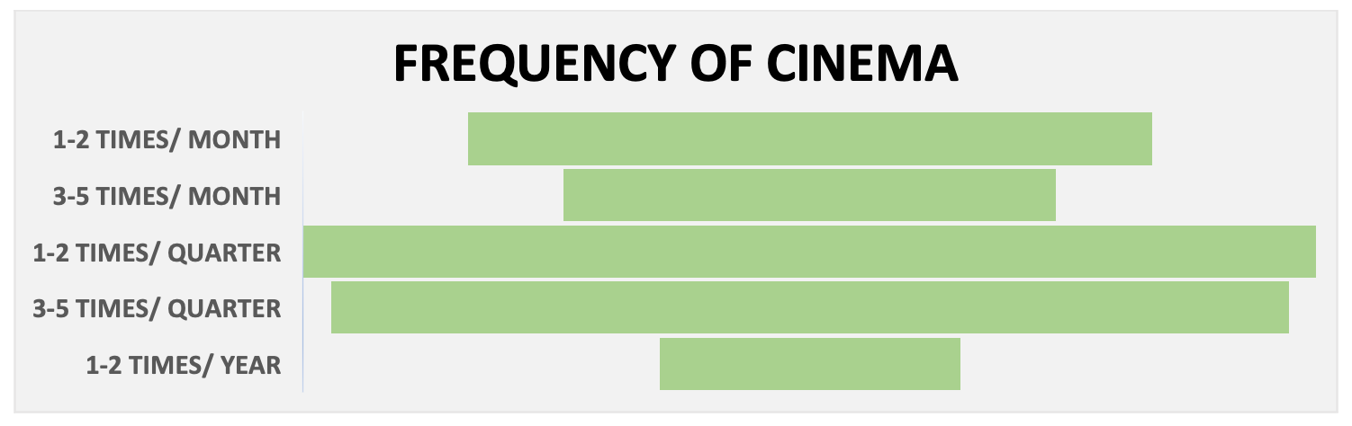 When queried about the frequency of their cinema attendance, the majority of respondents indicated that they attend between one and two times per quarter (29%), or between three and five times per quarter (28%). Twenty percent of respondents indicated that they prefer to attend the cinema one to two times per month, while 14 percent attend three to five times per month. Finally, only 9% of respondents indicated that they attend the cinema rarely, with an average of 1-2 times per year.