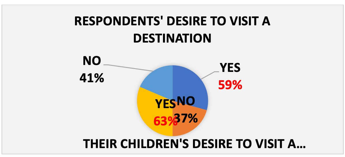 The data presented in the above figure indicates that both the participants who took part in our research and their children have a desire to visit a destination after watching a film. In particular, 59% of respondents indicated that their destination choice is influenced by seeing it in a movie, and 63% of their children expressed a desire to visit the destination they see through a movie.