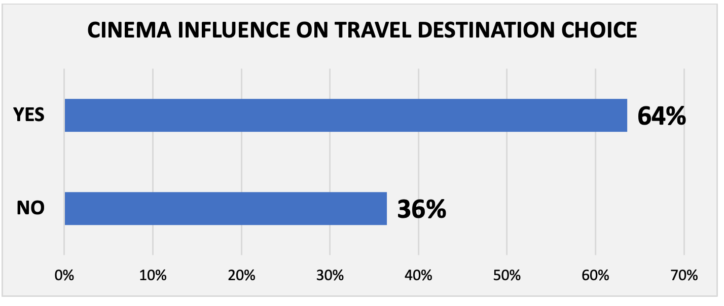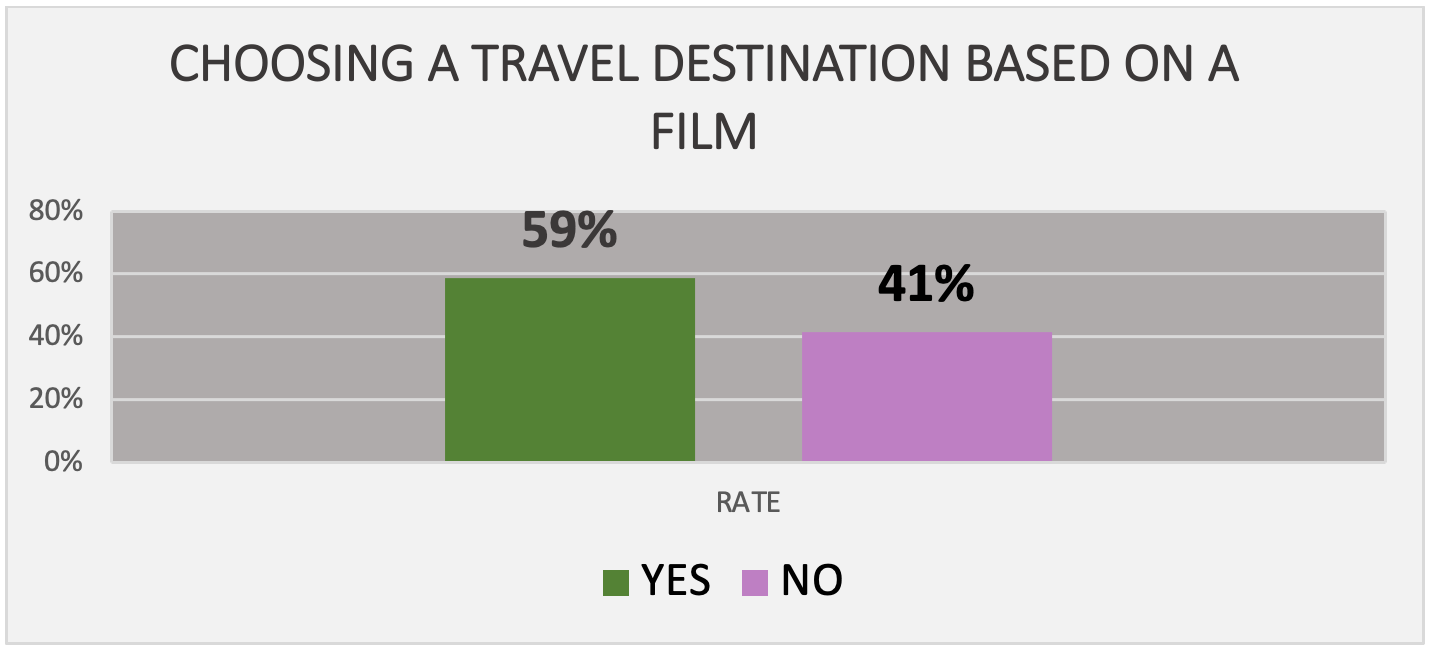 As illustrated in the graph above, a considerable proportion of participants (59%) appear to have selected a travel destination based on the occurrence of a film screening. A similarly noteworthy proportion of respondents (41%) appear to be indifferent to the association between the destination chosen and the viewing of a film.