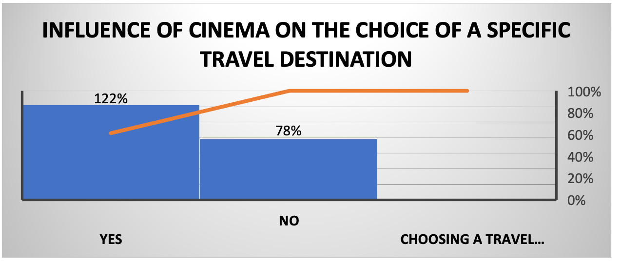 The results of the survey indicate that the majority of participants, 64%, believe that cinema has a positive impact on the choice of a travel destination through its promotion. Conversely, only 36% of respondents indicated that the promotion of a particular destination through cinema is not related to an increased inflow of tourists to that destination.