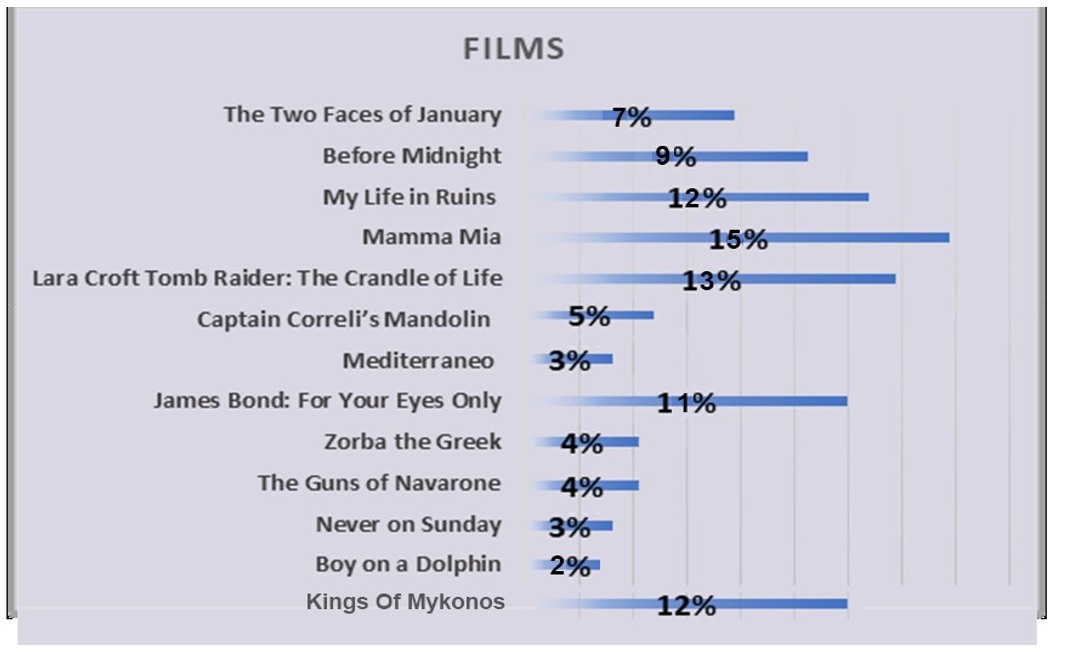 The results of the study indicated that the participants had viewed a significant number of foreign films, particularly those produced in the past 15 years. The following major film productions were observed to have a strong global appeal: Mamma Mia (16%), Lara Croft Tomb Raider: The films The Crandle of Life, My Life in Ruins, James Bond: For Your Eyes Only, Before Midnight, and The Two Faces of January were observed to have a strong global appeal, with the latter two films achieving particularly high ratings. Nevertheless, older foreign films also appear to be widely popular with audiences, as evidenced by the survey results. In particular, the films Captain Correli's Mandolin (6%), Zorba the Greek and The Guns of Navarone (5%), Never on Sunday and Mediterraneo (4%), as well as the legendary film Boy on a Dolphin (3%), appear to be well known, albeit by a small percentage of the population.