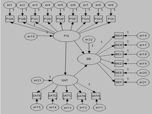As shown in Table 5, all the relationships reported are related in the expected direction. Perceived quality is significantly related to the other constructs, while its correlations with other variables are in the expected direction without statistical significance. This is consistent with the proposed model that perceived quality is directly related to satisfaction and behavioural intentions.