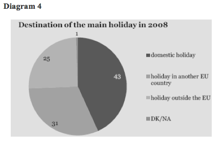 According to the “survey on the attitudes of europeans towards tourism” (2009), by european commissions barometer, the majority of european union citizens answered that they spent their main vacation in 2008 in their own country (43%). From those who travelled abroad, 31% stayed in europe, preferring [spain (7%), italy (5%), france (4%) and greece (3%)] and 25% travelled outside eu [with most popular destinations turkey (3%), the united states and croatia (both 2%)].