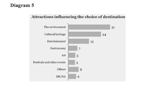 Their choice for visiting a destination was affected by different factors. First of all was the location’s environment (31%), second the cultural heritage (24%) and third the options for entertainment (15%). Other elements that determined their choice were gastronomy (7%), arts (5%), festivals and events (5%).